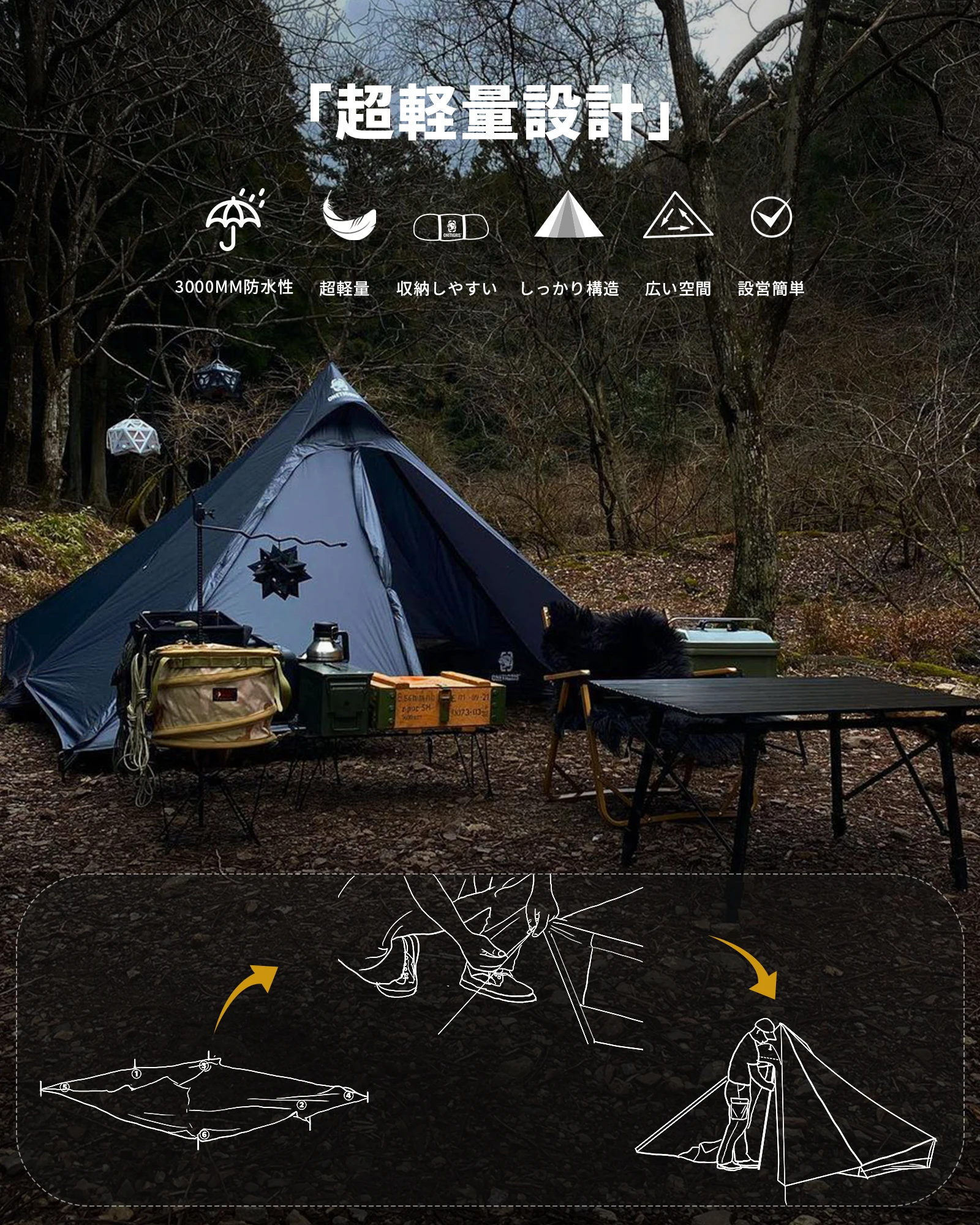 ●Tipi-shaped form that’s lightweight, easy to set up and extra wind-resistant, ideal for backpacking, hiking, bushcrafting, motobike traveling, backyard camping, etc.