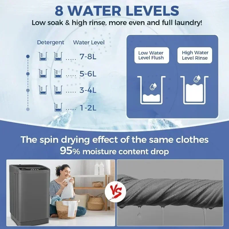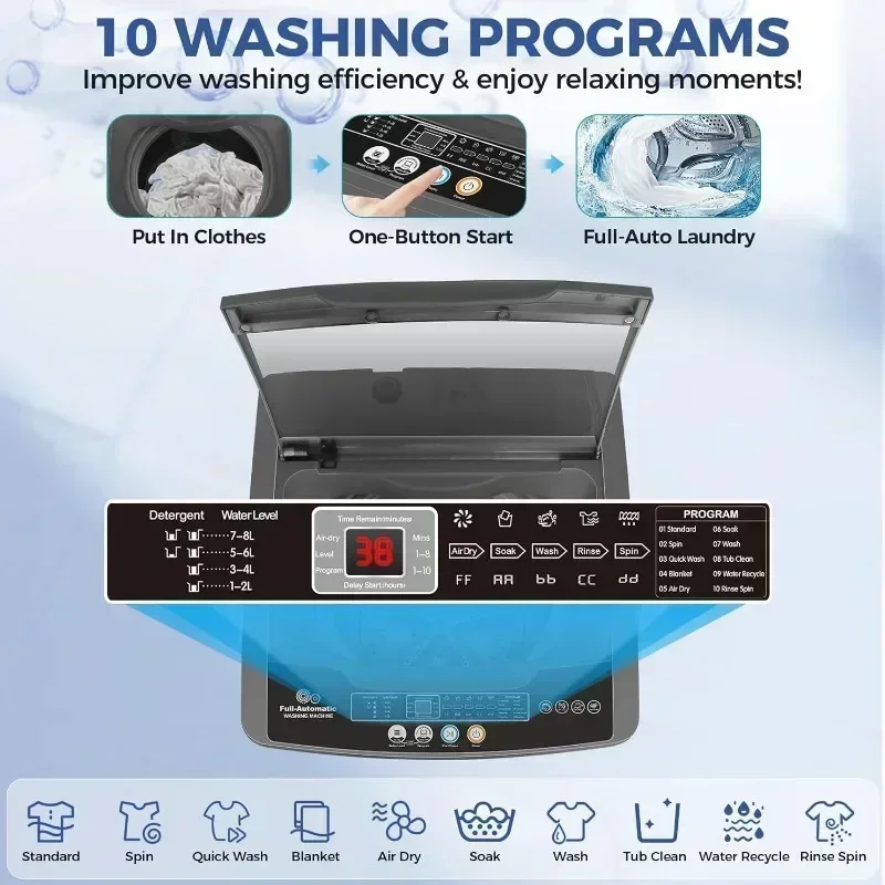 • [Easy to Operate]--This portable washing machine features a multifunctional control panel with 8 water levels and 10 programs, giving you the flexibility to choose one or more programs to customize your washing process to meet your different laundry needs.It has one-touch operation, simple and labor-saving, and the LED indicator light will display the remaining washing time.The washing and dehydration functions can be used independently, and the fully automatic function system frees your hands.